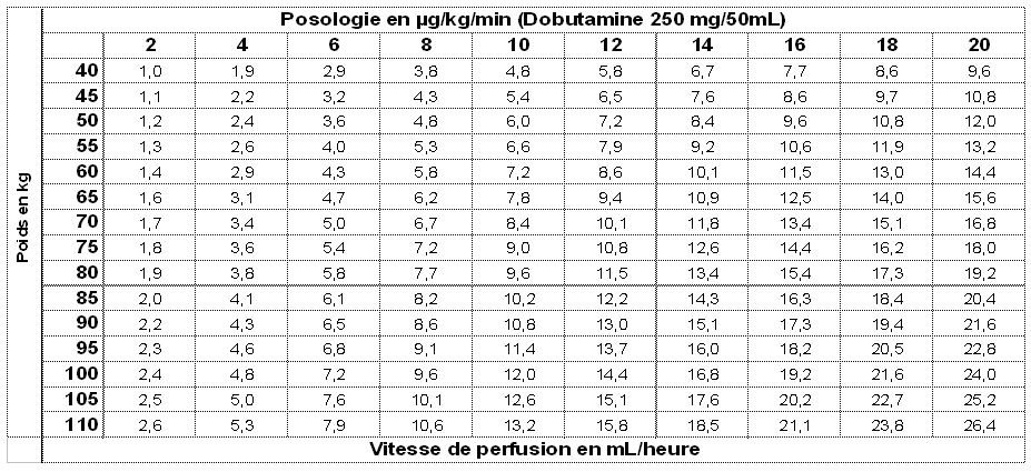 Pour la dobutamine (Dobutrex®) le flacon de 20 mL contient 250 mg de produit. La posologie prescrite est de 10 µg/kg/min et le patient pèse 75 kg