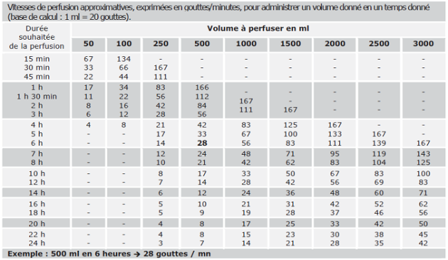 Le débit est de 30 000/1 440 = 20,83, soit 21 gouttes/minute