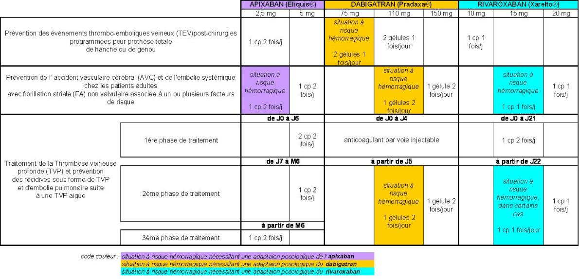 Depuis, les AMM ont introduit de nouveaux schémas posologiques → tableau ci-dessous = schémas posologiques des 3 AOD disponibles en novembre 2014 (source = RCP[1] des AOD commercialisés en France en novembre 2014) :