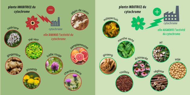 Pour résumer, il existe des inhibitrices et inductrices des cytochromes. Une même plante peut avoir des effets opposés sur des cytochromes différents. Ainsi, par exemple une plante peut être à la fois inhibitrice du CYP3A4 et inductrice CYP1A2.