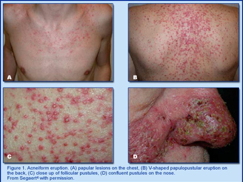 Les toxicités cutanées se manifestent par une éruption sur le visage, généralement rouge, avec une peau qui pèle légèrement.