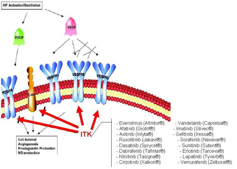Ce sont de petites molécules actives sur le domaine intracellulaire des récepteurs trans-membranaires cibles (ex. BCR-ABL, KIT, PDGF, EGF, HER2,RAF1, ...).