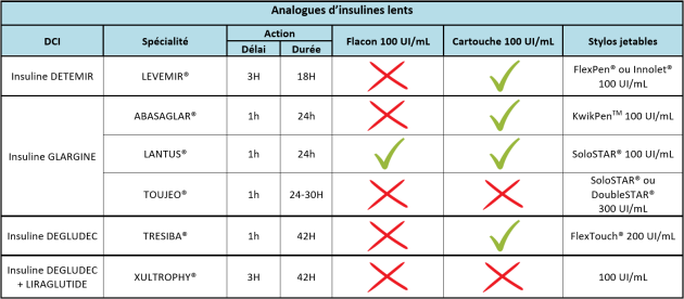 Analogues lents : 1 injections par jour indépendante des repas mais à HEURE FIXE (± 1h)