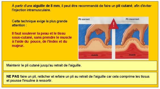 Maintenir le pli pendant que l'on injecte l'insuline, et le maintenir jusqu'à ce que l'aiguille soit sortie de la peau (car si on relâche le pli avant que l'aiguille ne soit sortie, il y a un risque que l'aiguille aille dans le muscle).