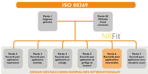 La partie 6 de la norme : ISO 80369-6 correspond à la connectique dédiée aux voies neuraxiale et péri neurale appelée NRFit pour Neuraxial and Regional anaesthesia Fit.