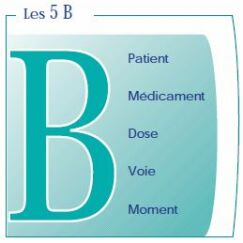 toujours respecter la règle des 5 B = le Bon médicament, au Bon patient, au Bon moment, au Bon dosage, par la Bonne voie d'administration