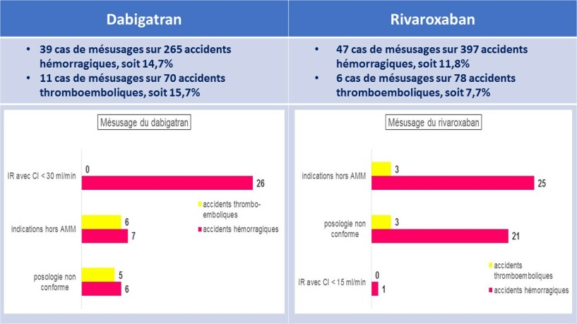Entre septembre 2013 et février 2014, le comité technique de pharmacovigilance (CTPV) de l'ANSM a mis en évidence des cas de mésusage du dabigatran et du rivaroxaban dans des accidents hémorragiques et thromboemboliques (source [pdf]).