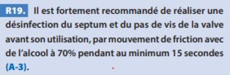 Il est fortement recommandé de réaliser une désinfection du septum et du pas de vis de la valve avant son utilisation, par mouvement de friction avec de l’alcool à 70% pendant au minimum 15 secondes.(Guide SF2H mai 2019 : Prévention des infections liées aux cathéters périphériques vasculaires et sous-cutanés [pdf])
