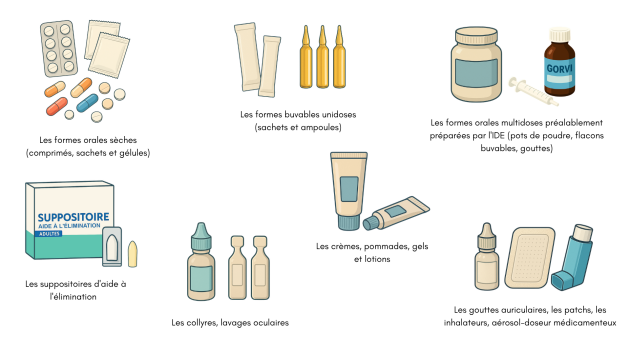 Les formes orales multidoses préalablement préparées par l'IDE (pots de poudre, flacons buvables, gouttes) sous réserve du respect des recommandations : recherche d'une alternative, protocoles de soins et habilitations préalables,