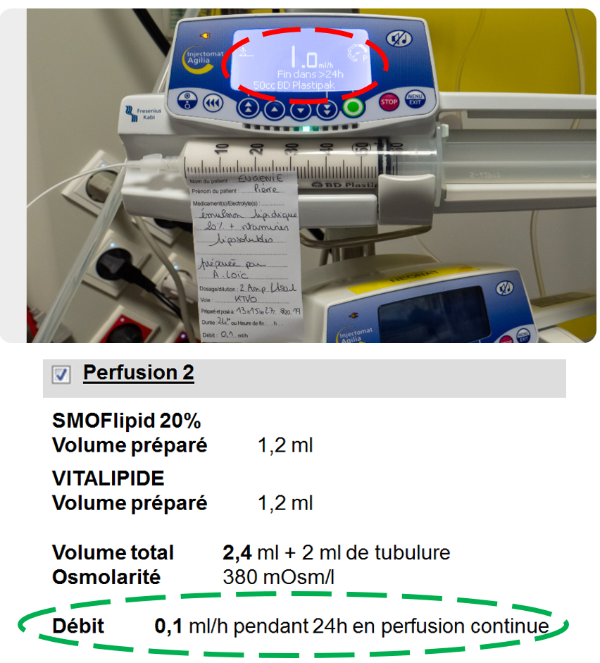 La cohérence entre le débit horaire affiché et le volume perfusé