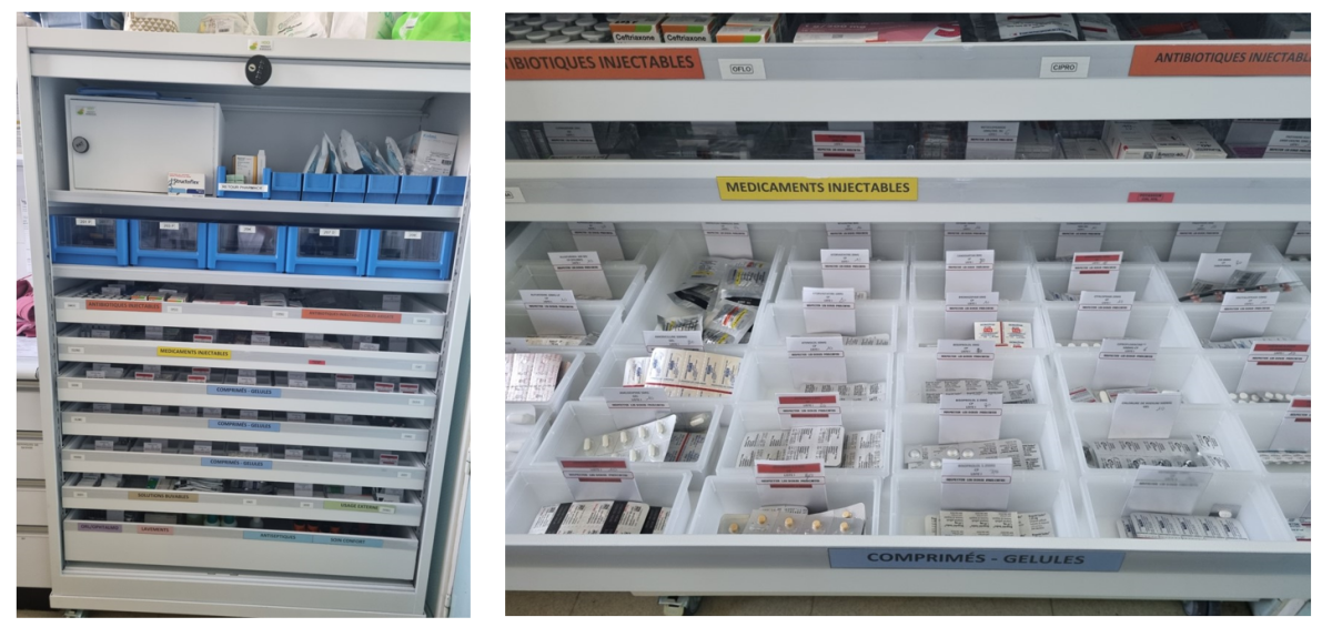 Les étiquettes sont harmonisées respectant les codes couleurs internationaux des classes médicamenteuses des médicaments injectables pour les bacs de rangement dans tous les lieux de stockage de médicaments