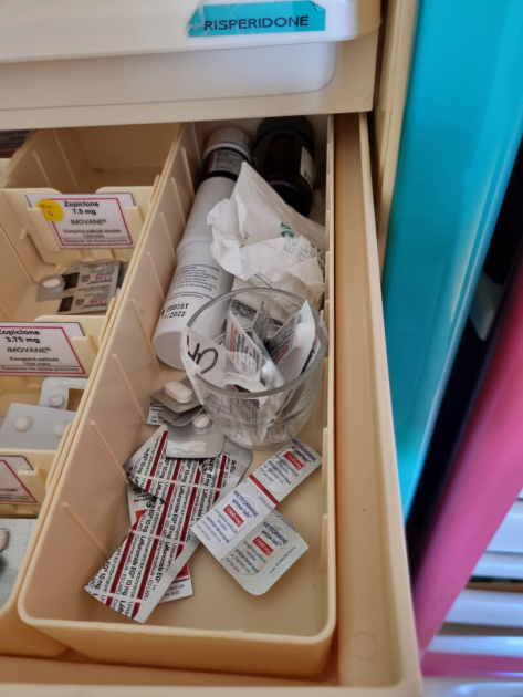 Ces médicaments nominatifs ne sont pas stockés au nom du patient (étiquette patient). De plus, les blisters sont découpés et ne permettent pas une identification de chaque unité jusqu'à l'adminsitration