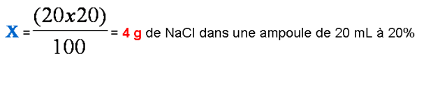 Il nous faut 6 g de NaCl, soit 1,5 ampoules à 20%, soit 30mL