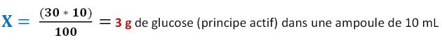 Une ampoule dosée à 30% signifie 30 g de principe actif dans 100 mL. A partir de cette correspondance, on peut poser le tableau suivant :
