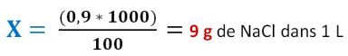 0,9 % signifie que l'on a 0,9 g de NaCl dans 100 mL. Posons le tableau suivant :