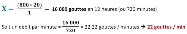 Nous savons que 20 gouttes de soluté hydrique = 1 mL, or nous voulons perfuser un volume de 800 mL sur une durée de 12 heures soit 720 minutes.