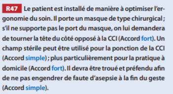 Mettre un masque de type chirurgical au patient, lui faire tourner la tête du coté opposé à la CCI (s'il ne le supporte pas, juste lui faire tourner la tête du côté opposé)