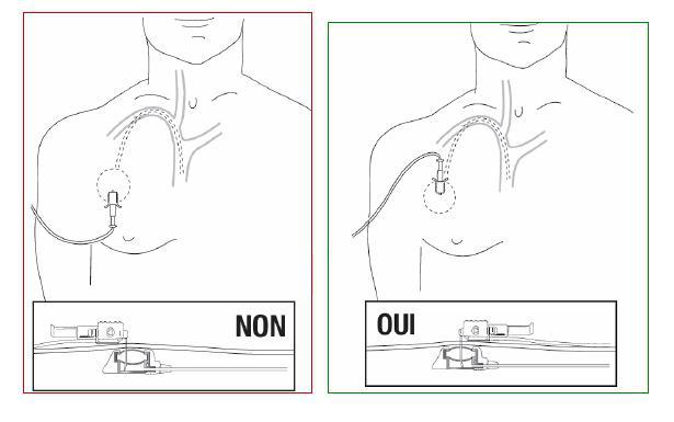 Pour limiter, le déplacement de l'aiguille, le risque de diffusion de médicament hors de la chambre (extravasation) → utiliser des bandelettes de fixation pour maintenir l'aiguille en place lors des mouvements du patient