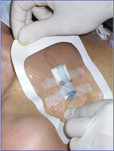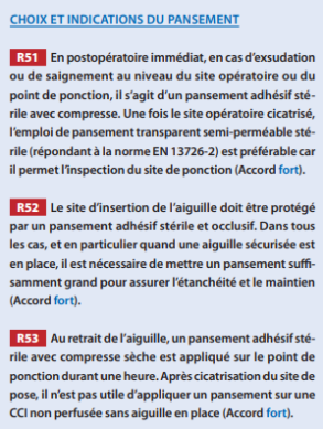 La zone d'injection est habituellement recouverte d'un pansement adhésif transparent semi-perméable stérile qui permet de surveiller le point d'implantation de l'aiguille