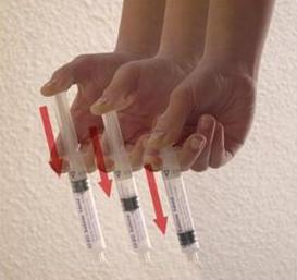 Avec au moins 10 mL de NaCl 0.9%. Le rinçage doit être pulsé en 3 poussées successives sur le piston de la seringue. | ![]() |