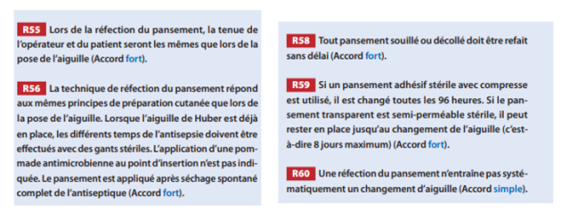 Au retrait de l'aiguille, un pansement adhésif stérile avec compresse sèche est appliqué sur le point de ponction durant une heure. Après cicatrisation du site de pose, il n'est pas utile d'appliquer un pansement sur une CCI non perfusée sans aiguille en place (Accord fort) R53 - SF2H.