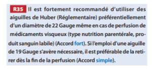 La SF2H[1] recommande d'utiliser une aiguille de Huber de 22G dans son guide « Prévention des infections associées aux chambres à cathéter implantables pour accès veineux » -2012 (Recommandation R35).