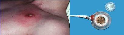Les infections de CCI se manifestent par une inflammation sur le trajet du cathéter, un suintement, ou des signes d'abcès de la loge de la chambre implantée. Même sans signes locaux, une infection est à évoquer en cas de frissons, d'hyperthermie, voire de choc septique dans les heures qui suivent la manipulation de la chambre.