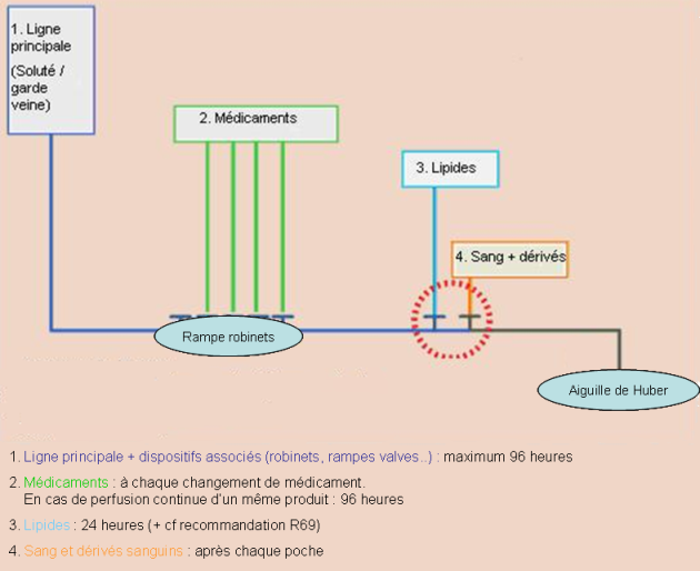 « Les sites d'injection de la ligne principale (ligne en bleu) sont éloignés de la literie (utiliser un porte rampe de robinet) »