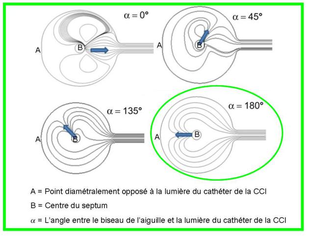 Après perfusion, rotation à 180° du biseau de l'aiguille car l'efficacité du rinçage de la CCI semble améliorée lorsque le jet de rinçage est dirigé du côté opposé au cathéter selon les données publiées en 2012