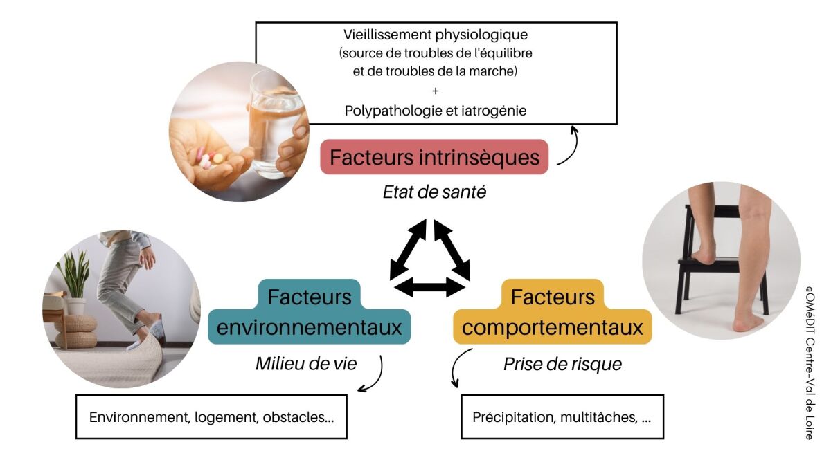 La chute est la conséquence de plusieurs mécanismes associés à différents facteurs de risque possibles.