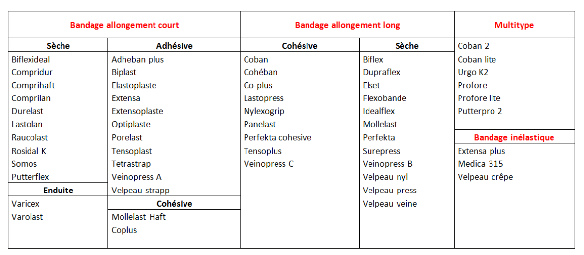 inélastiques : anti-œdème, possible en cas AOMI, portée 24h/24, non remboursées SS, ex. Somos™ (coton), Medica315™ (coton), RosidalK™, Velpeau crêpe ™