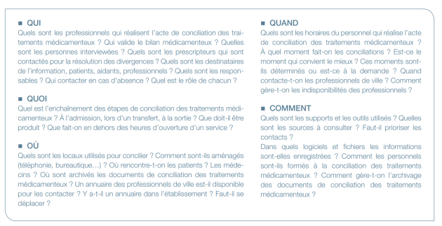Une équipe pluridisciplinaire, intégrant un pharmacien (PUI ou officine) est identifiée pour piloter le processus de conciliation médicamenteuse. Elle a pour missions de définir le cadre du processus :