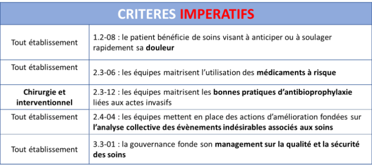Au nombre de 17, les critères du référentiel indiqués comme "impératifs" seront spécifiquement évalués, points portant une exigence et une attente forte.