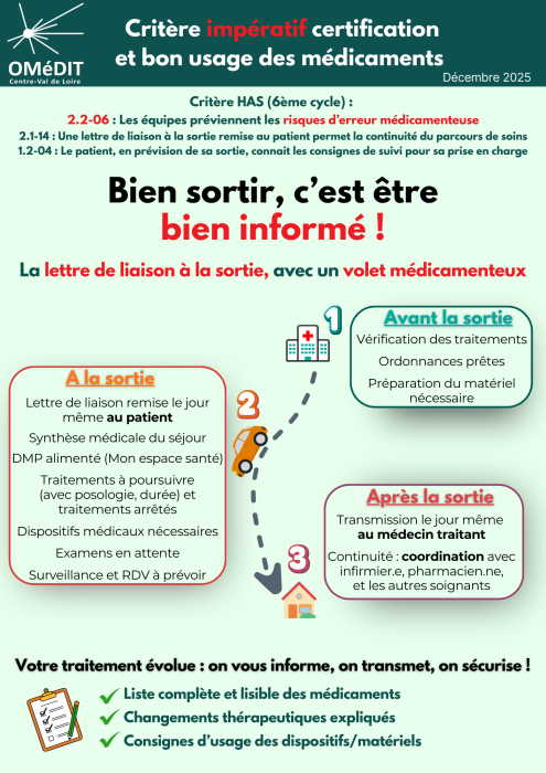 « En prévision de sa sortie, le patient est informé sur les éventuels nouveaux traitements prescrits, la nécessité de signaler tout effet indésirable lié au traitement, et dispose d'un comparatif expliqué entre le traitement d'entrée et de sortie. »
