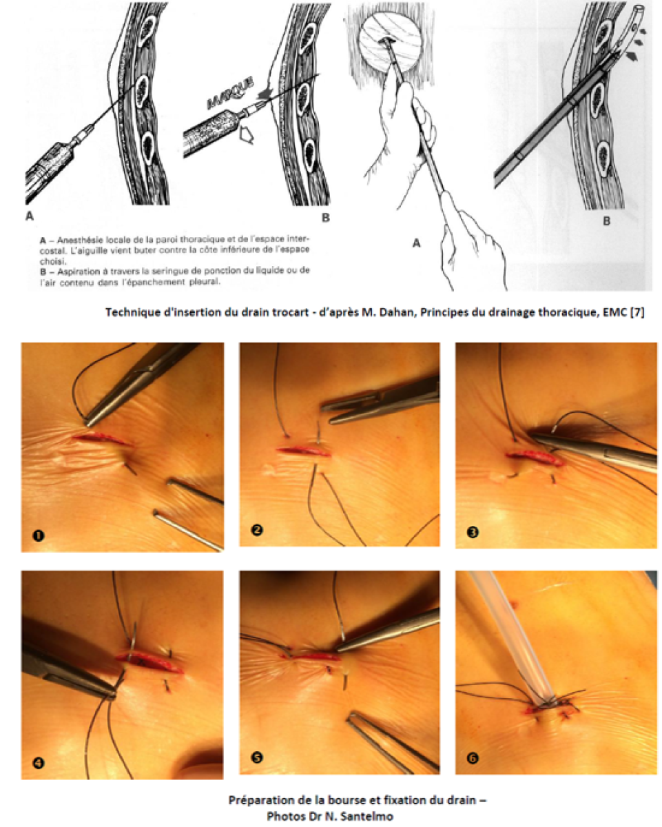Insérer le trocart et retirer le mandrin. L'évacuation d'air sous pression ou de liquide confirme la bonne position du drain dans la cavité pleurale