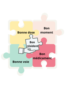 Le respect de la règle des 5B [pdf] est essentielle : Le bon résident, le bon médicament, la bonne dose, la bonne voie et le bon moment.
