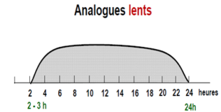 Analogues lents : 1 injection par jour indépendante des repas mais à HEURE FIXE (± 1h)