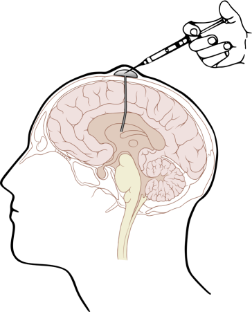 L'injection intraventriculaire est permise grâce au réservoir d'Ommaya. Le réservoir d'Ommaya est un implant en forme de dôme qu'on place sous le cuir chevelu lors d'une intervention chirurgicale. Un cathéter relie le réservoir aux ventricules. Grâce à ce dispositif médical, des médicaments peuvent être administrés directement dans le LCR des ventricules cérébraux. Le recours à la ponction lombaire n'est plus nécessaire.