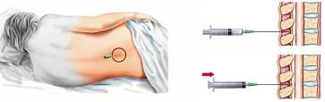 L'injection intrathécale est une injection dans l'espace sous-arachnoïdien. L'espace sous-arachnoïdien constitue le canal rachidien et contient le liquide céphalo-rachidien (LCR). L'injection intrathécale permet d'administrer le médicament dans le LCR. En pratique, l'injection est effectuée à l'étage lombaire (entre les vertèbres L3/L4 ou L4/L5) au dessous de l'extrémité de la moelle épinière. |
