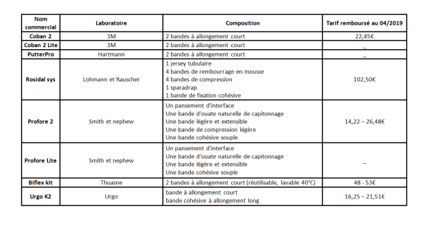 Composition des kits et systèmes de compression veineuse commercialisés