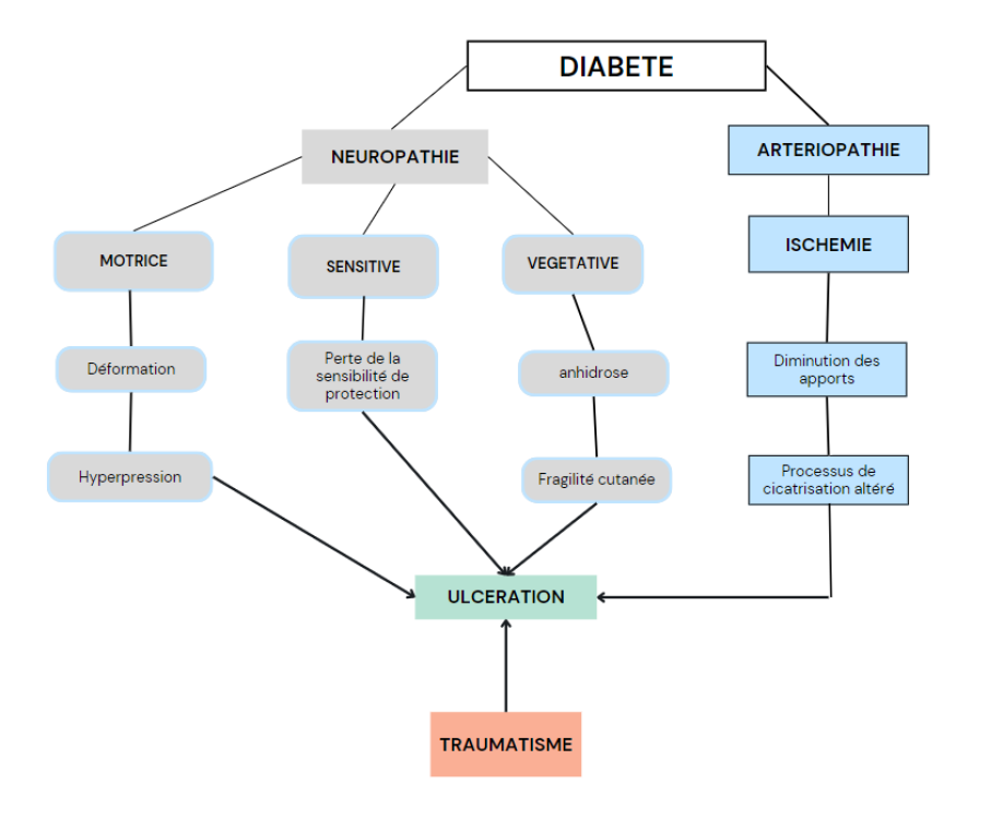 Le diabète peut entrainer une artériopathie (diminution de la lumière des artères ) aboutissant à un défaut d'oxygénation qui peut aboutir à une altération de la microcirculation et une ischémie des artères au niveau du pied et donc une diminution des apports en O2 et éléments du sang.