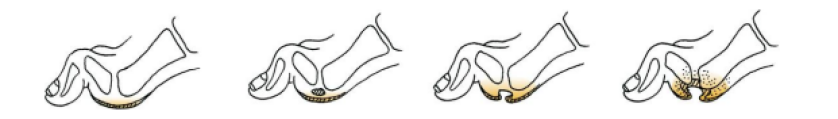 une deuxième phase chronique : une reconstruction anarchique ostéo-articulaire se produit aboutissant à une déformation souvent sévère du pied.