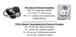 IPS (Index de Pression systolique): c'est une méthode non invasive de diagnostic de l'AOMI. Elle consiste à mesurer la pression systolique au niveau brachial et au niveau de la cheville du patient. L'indice IPS = PAS cheville / PAS bras.