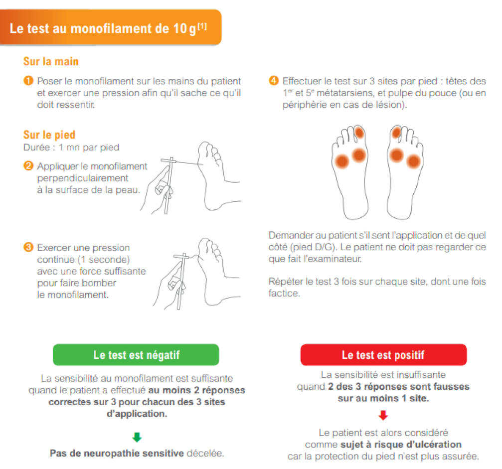 Une neuropathie: diagnostic par un test de sensibilité au monofilament. L'objectif est de tester la sensibilité de la plante des pieds au niveau de trois sites. Méthode du test de la sensibilité avec monofilament - HAS