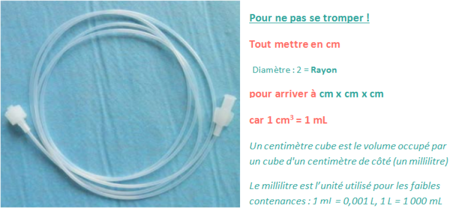 VR perfuseur : tubulure D3 mm L 180 cm = π × 0,15² × 180 = 12,72 mL (si on considère que la chambre compte-gouttes de 15mL est vide en fin de perfusion)