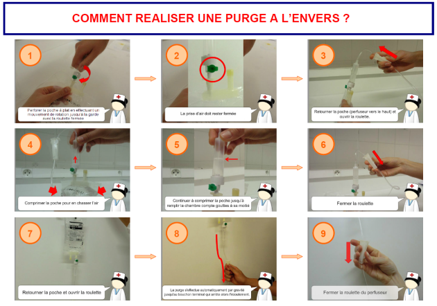 technique de "purge à l'envers[1]" des poches souples (sauf flacon Ecoflac®) qui consiste à chasser l'air de la poche et remplir la chambre compte-gouttes en comprimant la poche retournée.