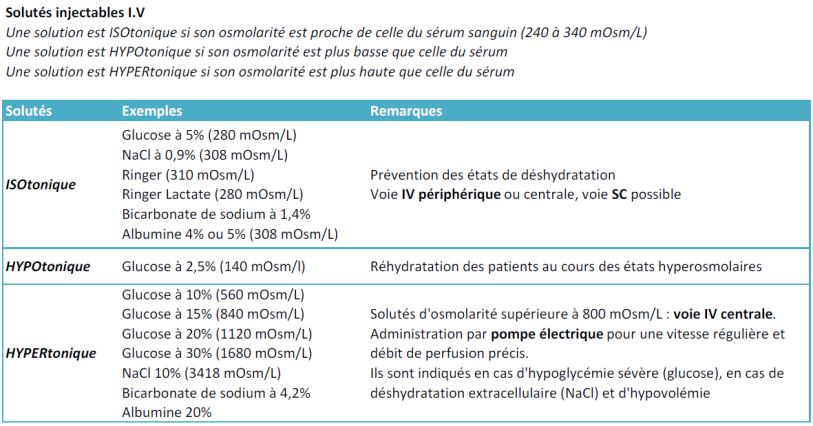 Il est rappelé que certains solutés hyperosmolaires ne doivent pas être perfusés sur voie veineuse périphérique, au risque de déclencher des veinites et des hémolyses.