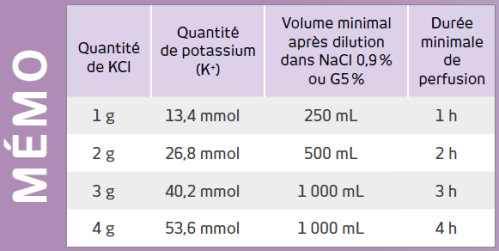 Diluer la solution hypertonique dans du NaCl 0,9 %. (Dilution dans G5 % à éviter en début de traitement car l'apport de glucose stimule la sécrétion d'insuline qui peut aggraver l'hypokaliémie)