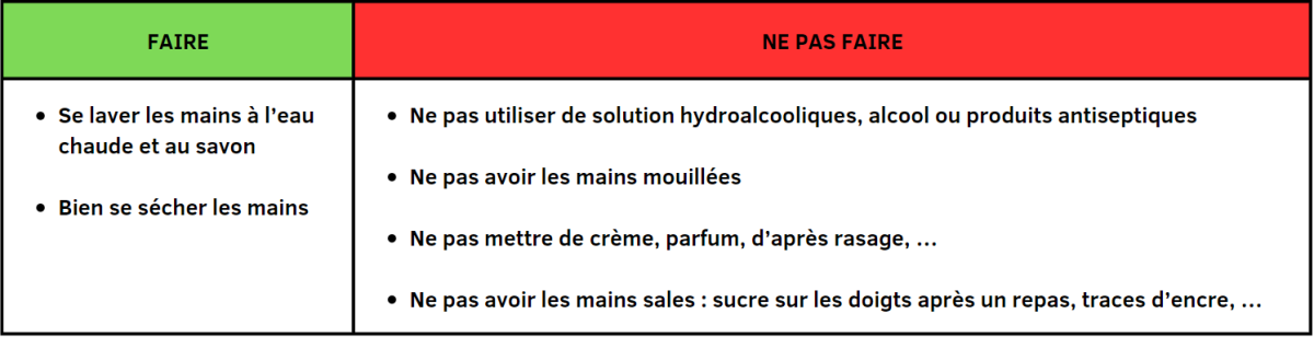 Si le patient effectue lui même le prélèvement, lui demander de bien se savonner les mains à l'eau chaude puis de les sécher soigneusement.