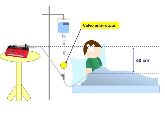 Si la hauteur concernée entre le point d'insertion du cathéter et la seringue du PSE est supérieure à 80 cm, il existe un risque de débit libre (écoulement par gravité) => utiliser une valve anti-siphon dans ce cas de figure